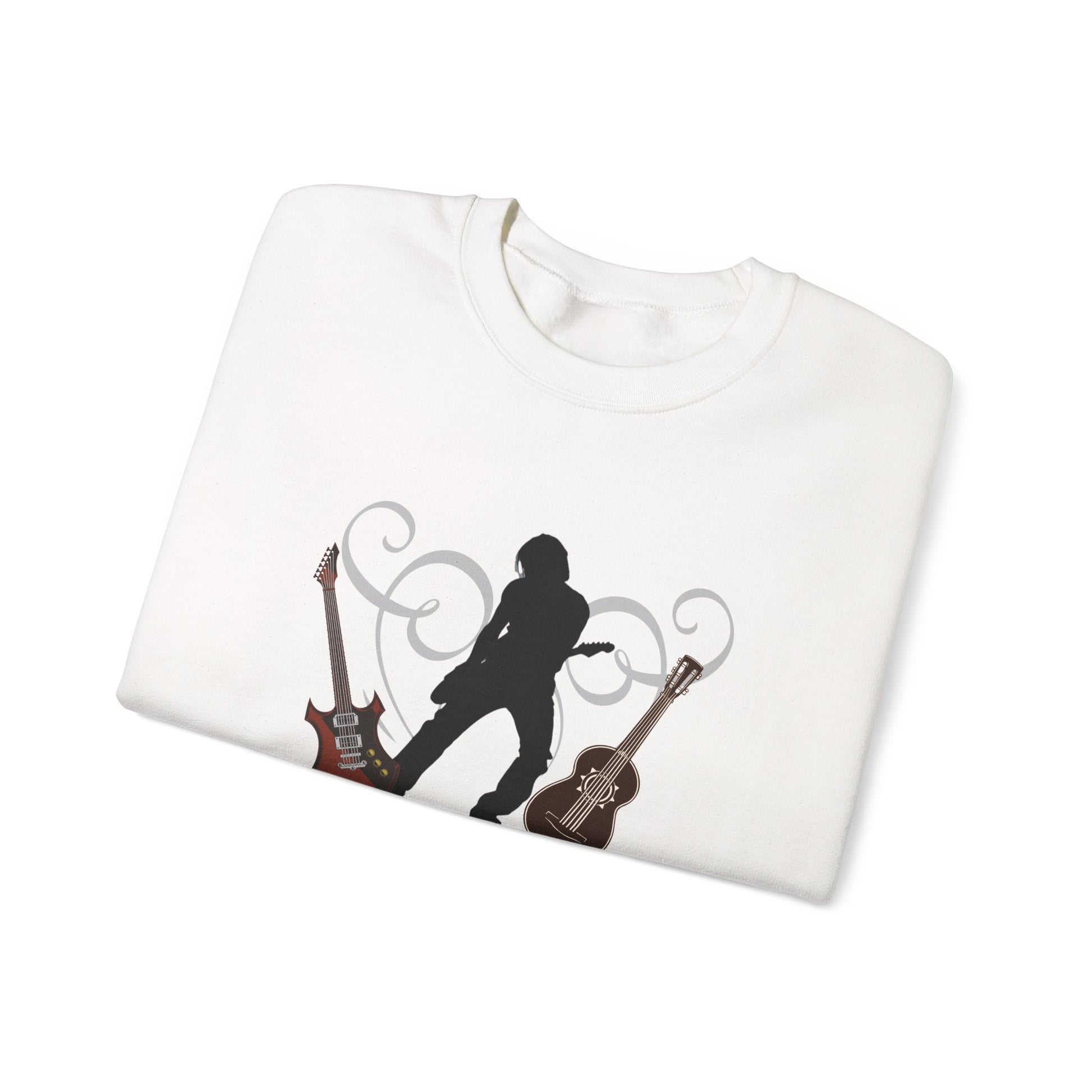 Featuring a bold silhouette of a guitar player in action, this design captures the essence of Keith Urban’s dynamic stage presence. Flanked by two intricately detailed guitars, one electric and one acoustic, it pays homage to Urban’s versatility as an artist. The word “URBAN” is emblazoned across the bottom in a striking font filled with a leopard print pattern, adding an edgy yet sophisticated touch to the sweater.